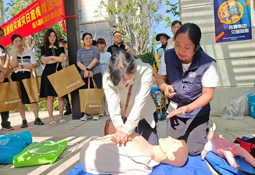 在互动体验环节,工作人员展示结绳演练并指导实操,保障群众掌握基本结绳逃生技能。现场还设置了仿真人体模型,医护人员指导群众进行心肺复苏操作练习,同时为群众演示海姆立克急救法操作流程。