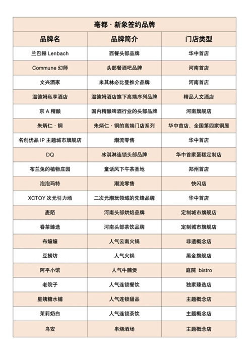发布会上,兰巴赫lenbach华中首店、commune幻师河南首店、米其林必比登推荐的文兴酒家河南首店、温德姆私享酒店、京a精酿河南旗舰店、朱炳仁·铜全国第四座铜屋“中原铜屋”华中首店、名创优品ip主题城市旗舰店华中首店、xctoy次元引力场华中首店、dq华中首家蛋糕定制门店、布兰兔的植物庄园郑州首店…等品牌确定进驻项目,占比超30%的首进品牌,让亳都·新象成为郑州首发经济的策源地之一。