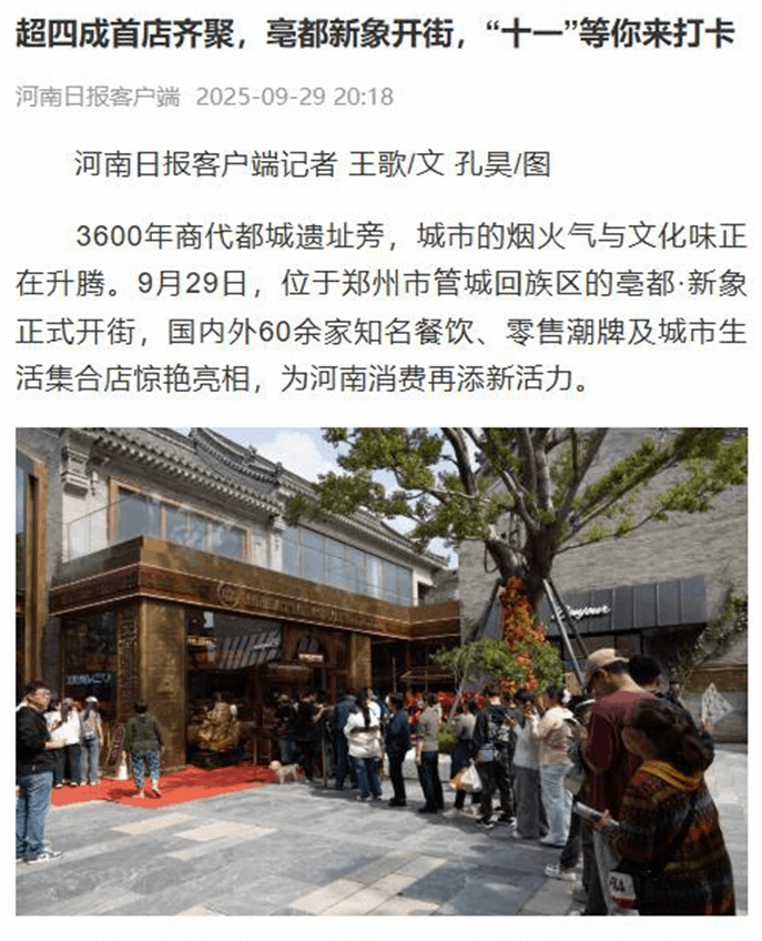 9月29日,备受瞩目的城市更新标杆项目——郑州“亳都·新象”商业街区正式开街迎客。凭借着独特的文化魅力与商业风格,开街首日,街区人潮涌动,客流量突破10万人次,项目取得了1亿 的线上累计曝光量。不仅销售业绩表现亮眼,取得了轰动性的开门红,也收到了业界专家发来的贺词和众多媒体的报道。
