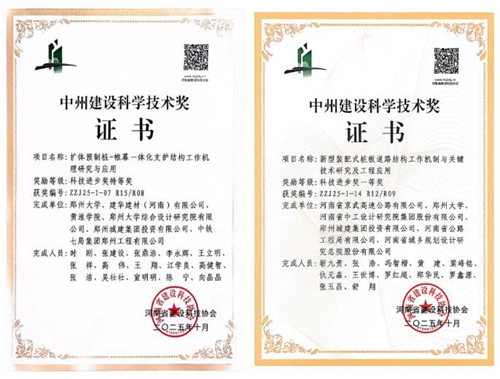 郑州城建集团的“扩体预制桩—帷幕一体化支护结构工作机理研究与应用”与“新型装配式桩板道路结构工作机制与关键技术研究及工程应用”两项科研项目,分获河南省“中州建设科学技术奖”特等奖和一等奖。