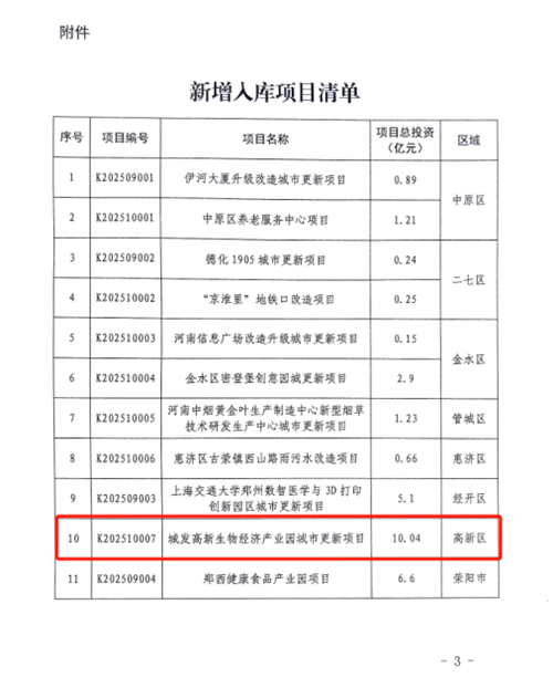 12月3日,郑州市城市更新项目库完成新一轮动态调整,郑州城发集团高新生物经济产业园城市更新项目成功通过评审,正式纳入市级项目库。这标志着该项目作为郑州市及高新区重点布局的战略性新兴产业载体,获得了关键性的政策支持与发展动能,为郑州“产业升级”的城市更新版图增添了重量级标杆。